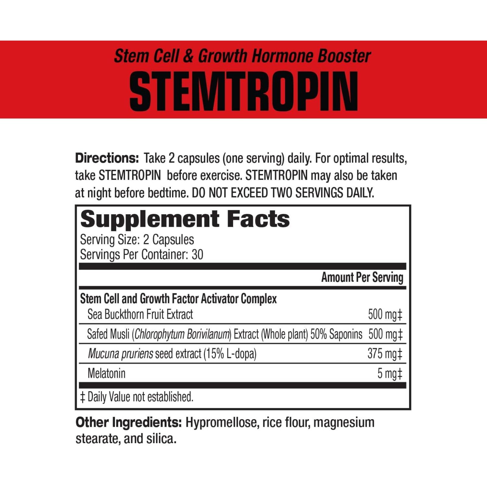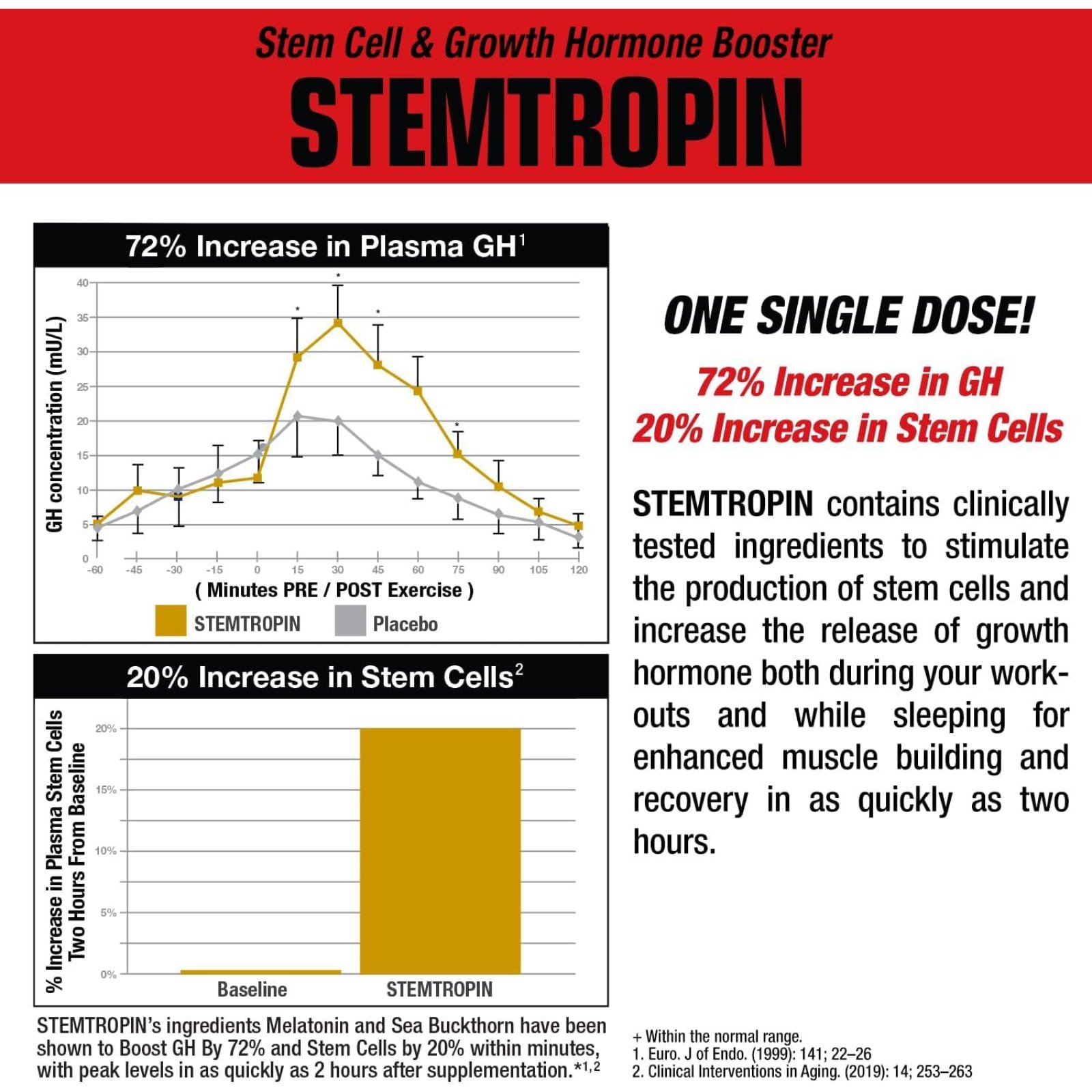 Stemtropin contains clinically tested ingredients to stimulate the production of stem cells and increase the release of growth hormone both during your workouts and while sleeping for enhanced muscle building and recovery in as quickly as two hours.